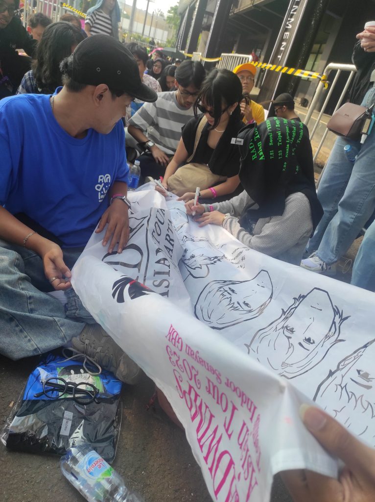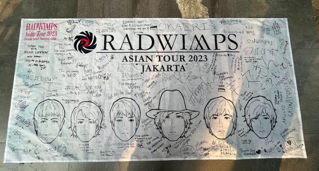 As we were lining up to enter the main gate, Yojiro suddenly appeared on the second-floor balcony, and all of us were freaking out. wkwk. All of the staff suddenly went outside to take some videos and pictures of us and our signed banner. I met Yojiro’s brother, Rin, either. Even I met the one and only, Takeshi Yao-san, RADWIMPS’ photographer, the cold hand behind the RADWIMPS photos :’).