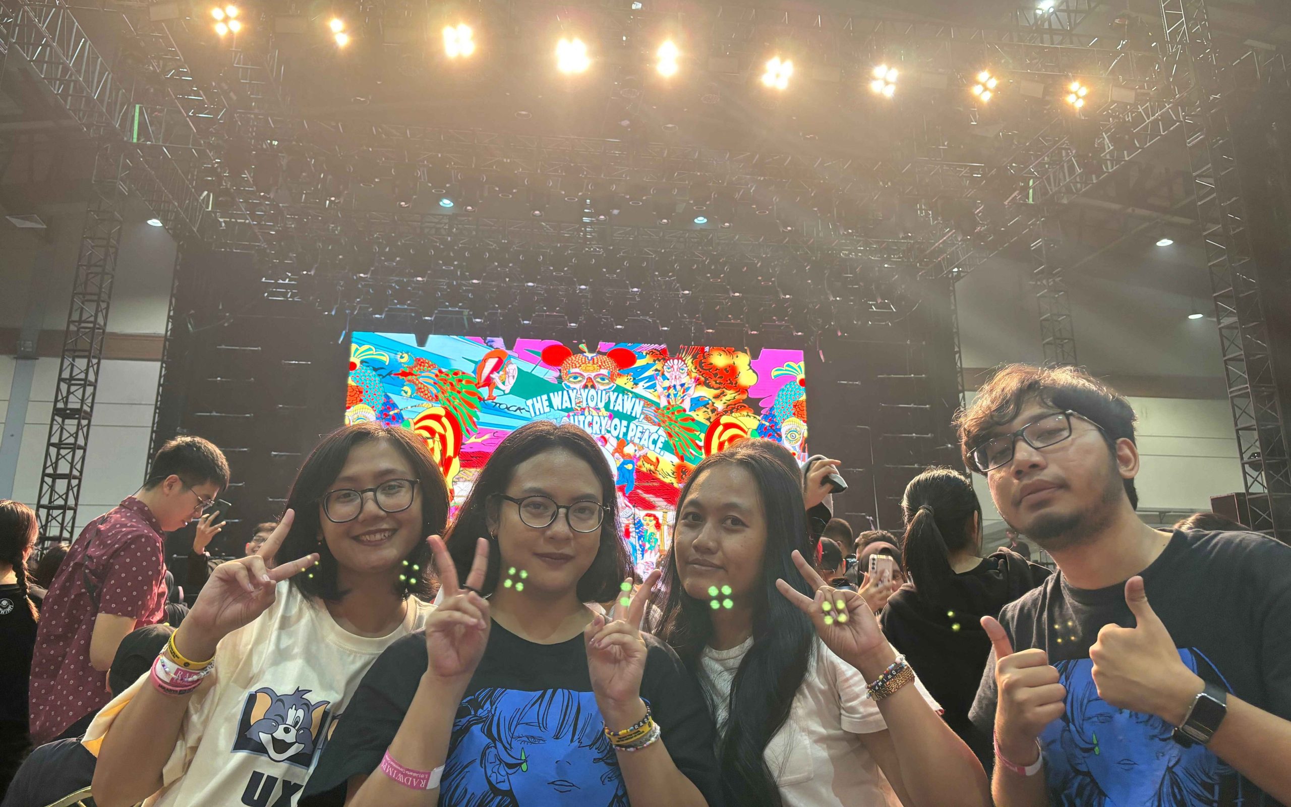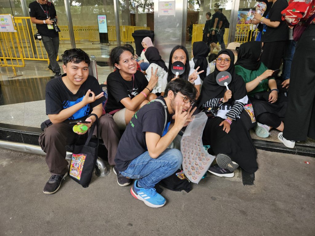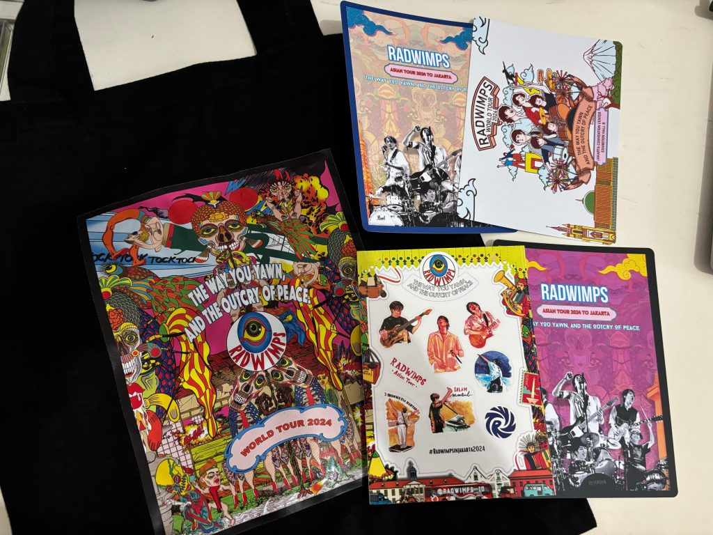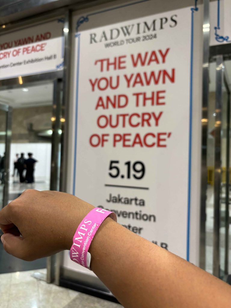 My friends and I went to the venue, Jakarta Convention Center, at around 1 p.m. The gate opened at 4 p.m., so we had so much free time. Arriving at the venue, it turned out lots of friends had arrived since early morning. We exchanged freebies or souvenirs with each other, and I got two full tote bags of souvenirs. There were some WIMPERS friends from neighboring countries such as Singapore, China, Hongkong, and Japan, CMIIW. Finally, I could meet Aya-san from Japan; we know each other from last year’s concert. It feels like RADWIMPS uniting us all into brothers and sisters.